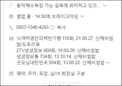 오늘n 산채비빔밥 정식은 14시 50분에 브레이크 타임이고요